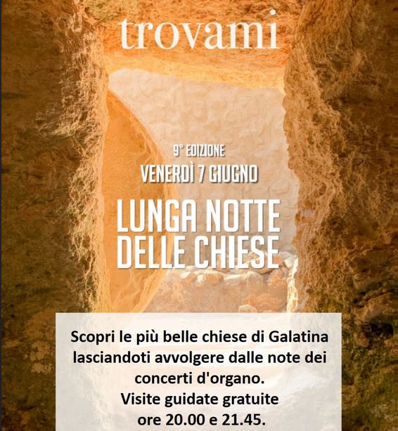 Giunta alla 9° edizione, Venerdì 7 giugno dalle 20.00 alle 23.30 ritorna “La Lunga Notte delle Chiese”, l'evento nazionale vede quest’anno la città di Galatina protagonista, grazie alla partecipazione di diverse chiese e volontari.
