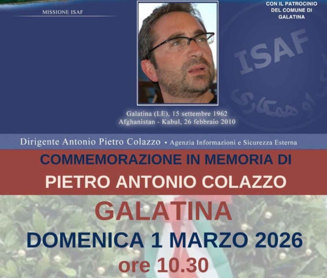 Proprio per questo, auspicando l’inizio di un percorso ampio e condiviso che possa, negli anni avvenire, dare il giusto risalto alla figura di un illustre galatinese che silenziosamente ha servito lo Stato e ha portato tanto lustro alla città di Galatina, domenica, 01 marzo 2026, deporremo una piccola di fiori presso l’area giochi in via Calatafimi a Galatina in onore del Funzionario dell’AISE (Agenzia Informazioni e Sicurezza Esterna) Dr. Pietro Antonio COLAZZO, insignito della “Croce d’onore alla memoria”, per essere caduto a Kabul il 26 febbraio del 2010, a soli 47 anni, durante un attentato terroristico in cui ha contribuito a salvare la vita di altri connazionali.