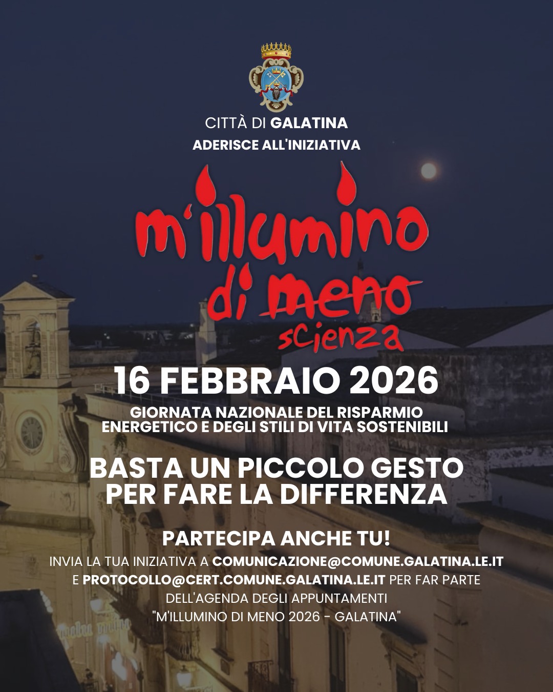 La Città di Galatina, anche quest’anno aderisce, per il 3° anno consecutivo, all’iniziativa “M’Illumino di Meno”, nata all’interno della trasmissione radiofonica Caterpillar e promossa da Rai Radio2 , che giunge alla XXII edizione e pone al centro il tema della Scienza come elemento per ridurre gli sprechi energetici.