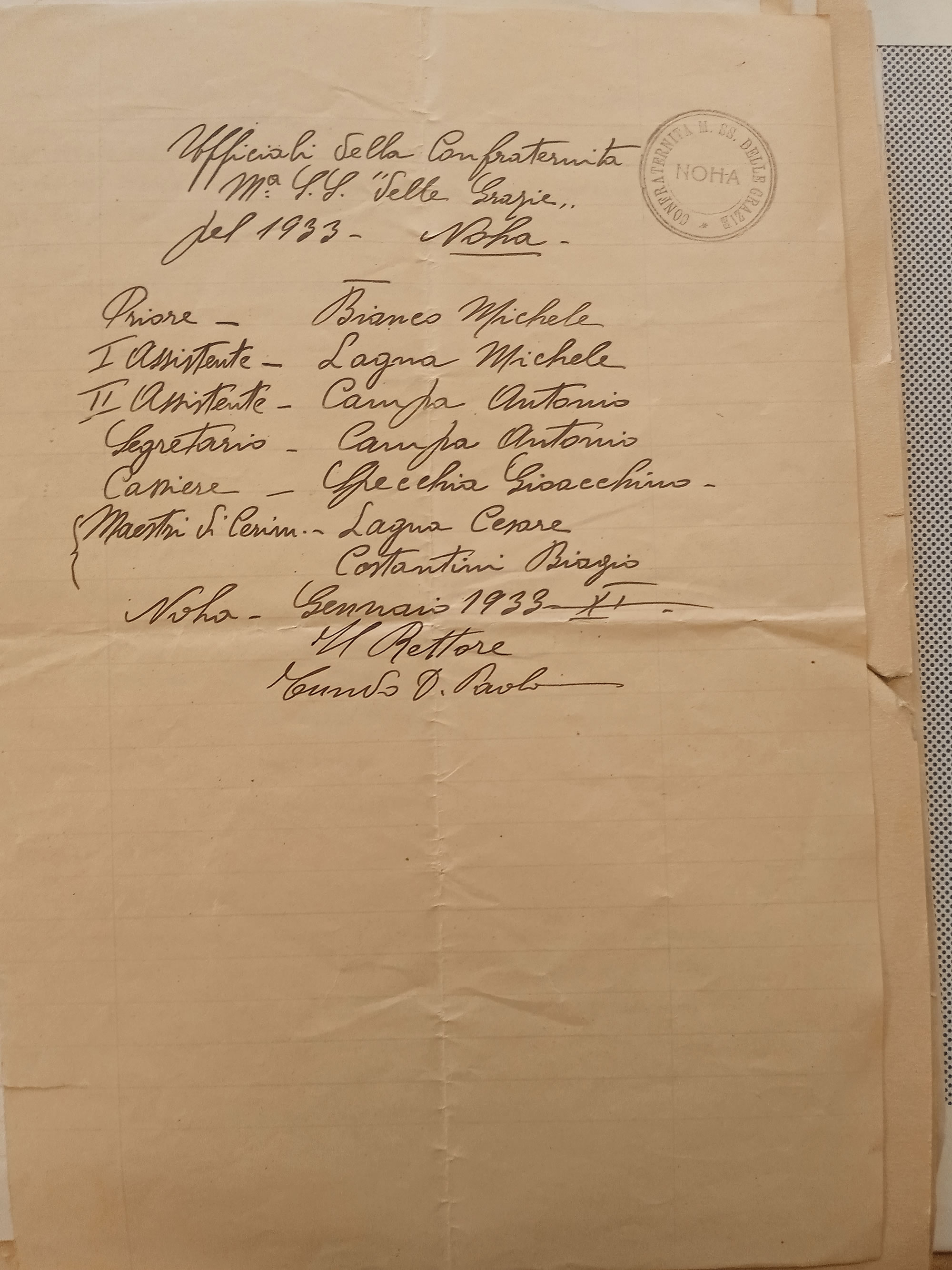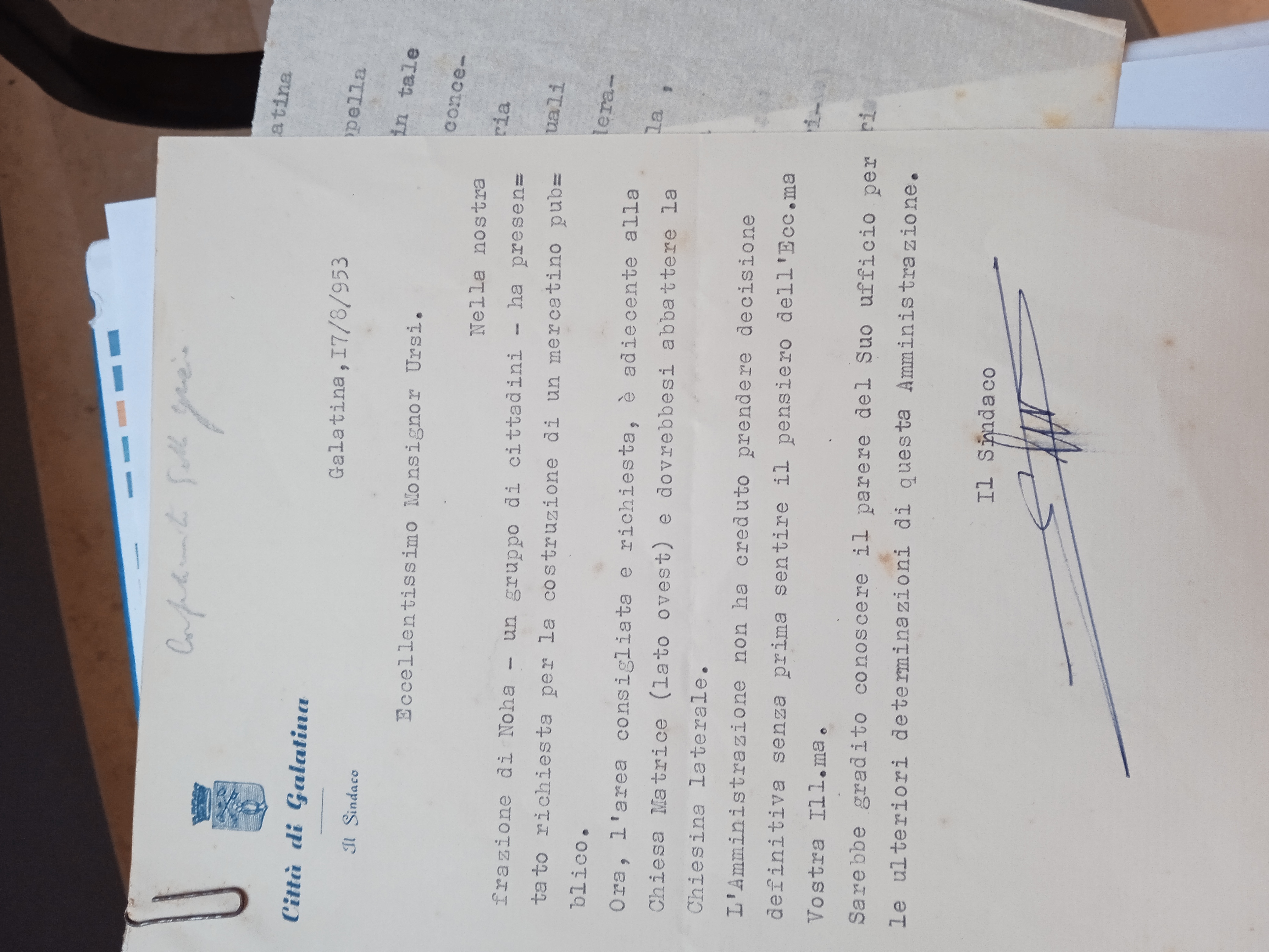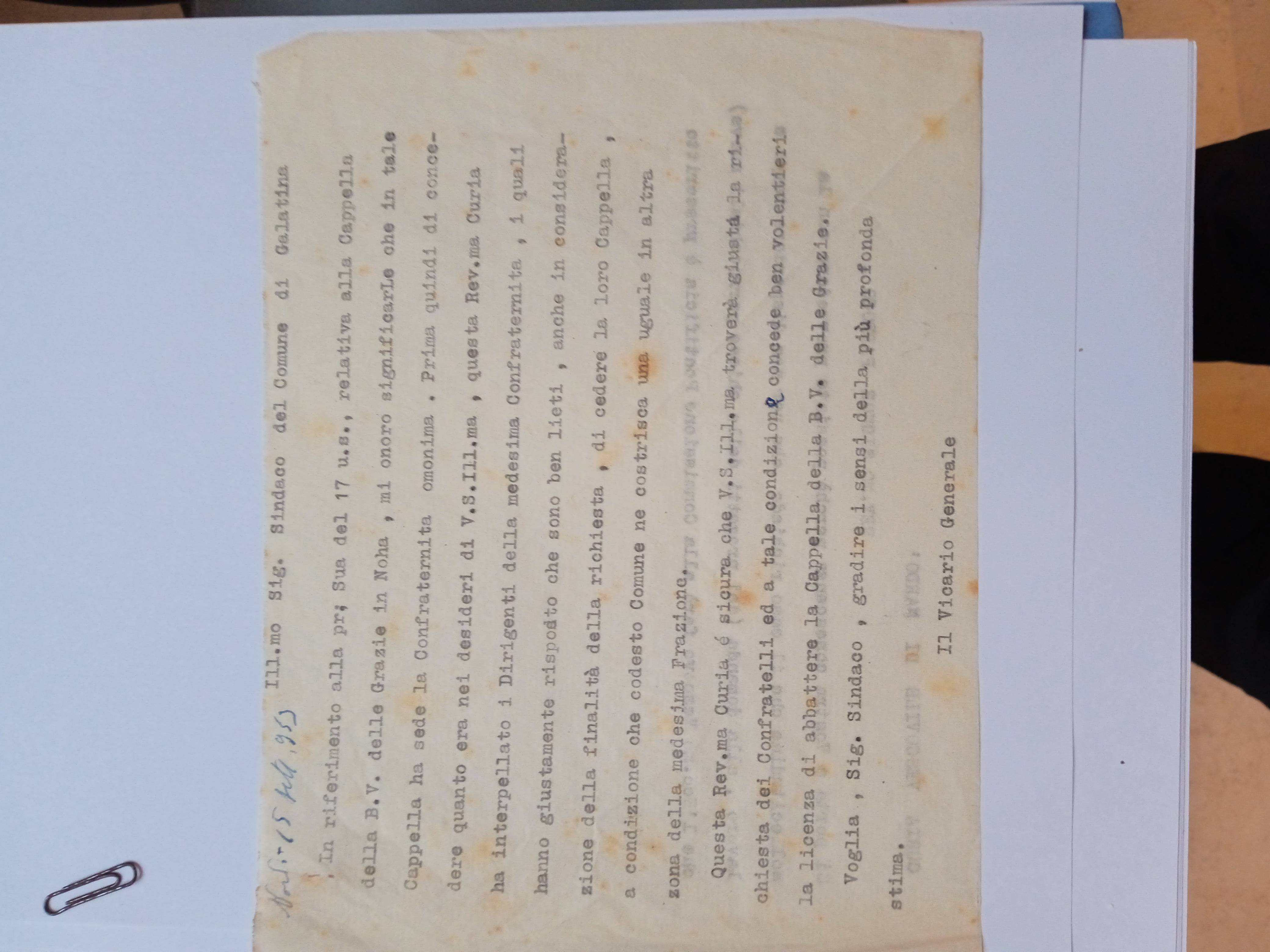 Ill.mo sig. Sindaco del Comune di Galatina. In riferimento alla precedente Sua del 17 u. s. relativa alla Cappella della Beata Vergine delle Grazie in Noha, mi onoro significarle che in tale Cappella ha sede la Confraternita omonima. Prima, quindi, di concedere quanto era nei desideri di V. S. Ill.ma, questa Rev.ma Curia ha interpellato i Dirigenti della medesima Confraternita, i quali hanno giustamente risposto che sono ben lieti, anche in considerazione della finalità della richiesta (IL MERCATINO), di cedere la loro Cappella a condizione che codesto Comune ne costruisca una uguale in altra zona della medesima frazione.