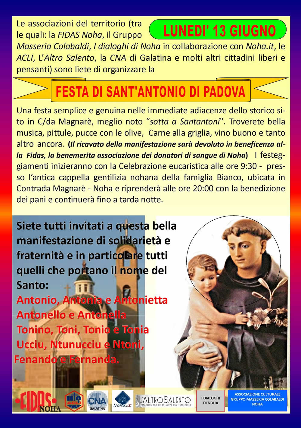 Lunedì 13 giugno le associazioni del territorio (tra le quali: la FIDAS Noha, il Gruppo Masseria Colabaldi, I dialoghi di Noha in collaborazione con Noha.it, le ACLI, L'Altro Salento, la CNA di Galatina e molti altri cittadini liberi e pensanti) sono liete di organizzare la FESTA DI SANT'ANTONIO.