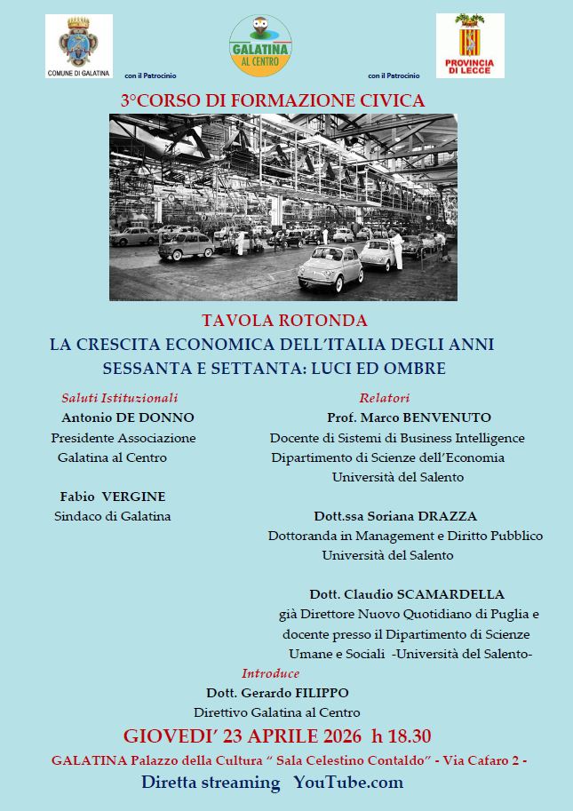 “La crescita economica dell’Italia negli anni sessanta e settanta: luci e ombre” è il tema del quarto incontro del Corso di formazione civica “Pro Civicum”, giunto alla terza edizione, organizzato dall’associazione Galatina al Centro. Il filo conduttore del corso di formazione: “La Repubblica compie 80 anni. Origine – evoluzione – prospettive”, ha consentito di approfondire nei diversi incontri già tenuti e programmati vari aspetti della società italiana così come sono stati affrontati nel corso di questi anni, dalla nascita della Repubblica ad oggi.