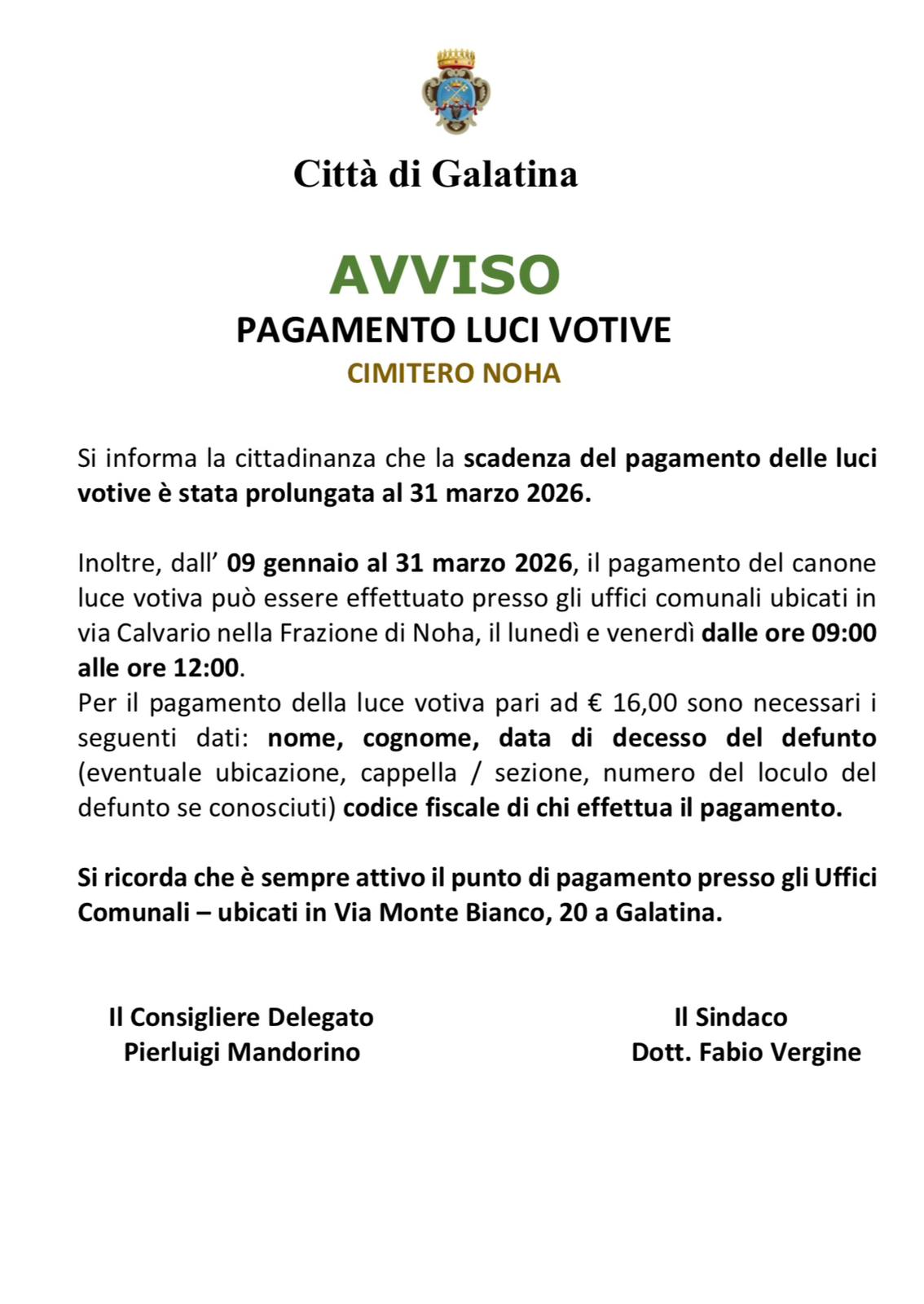 Si informa la cittadinanza che la scadenza del pagamento delle luci votive é stata posticipata al 31 Marzo 2026