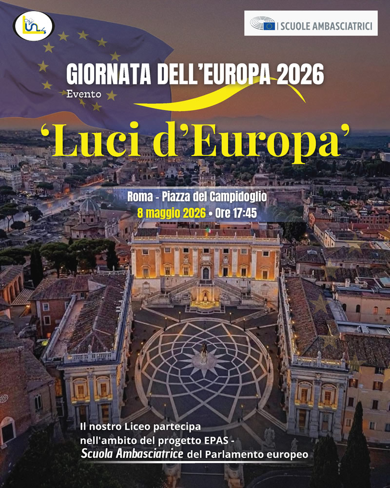 Il nostro Liceo parteciperà all’edizione 2026 della Giornata dell’Europa, prendendo parte all’evento “Luci d’Europa”, in programma l’8 maggio nella suggestiva cornice di Piazza del Campidoglio a Roma.