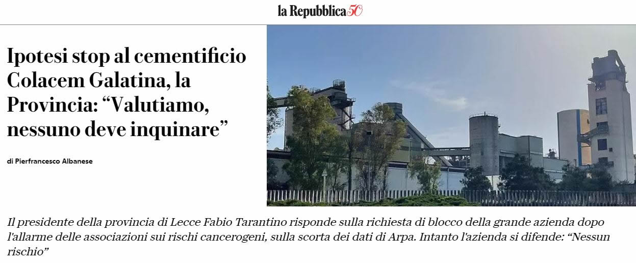 Il 10 aprile una delegazione di associazioni ambientaliste è stata ricevuta dal Presidente della Provincia di Lecce, Fabio Tarantino, nell’ambito della procedura di valutazione sanitaria dell’impatto delle attività dello stabilimento Colacem Galatina, prevista nel riesame dell’Autorizzazione Integrata Ambientale (AIA), sulle popolazioni esposte.