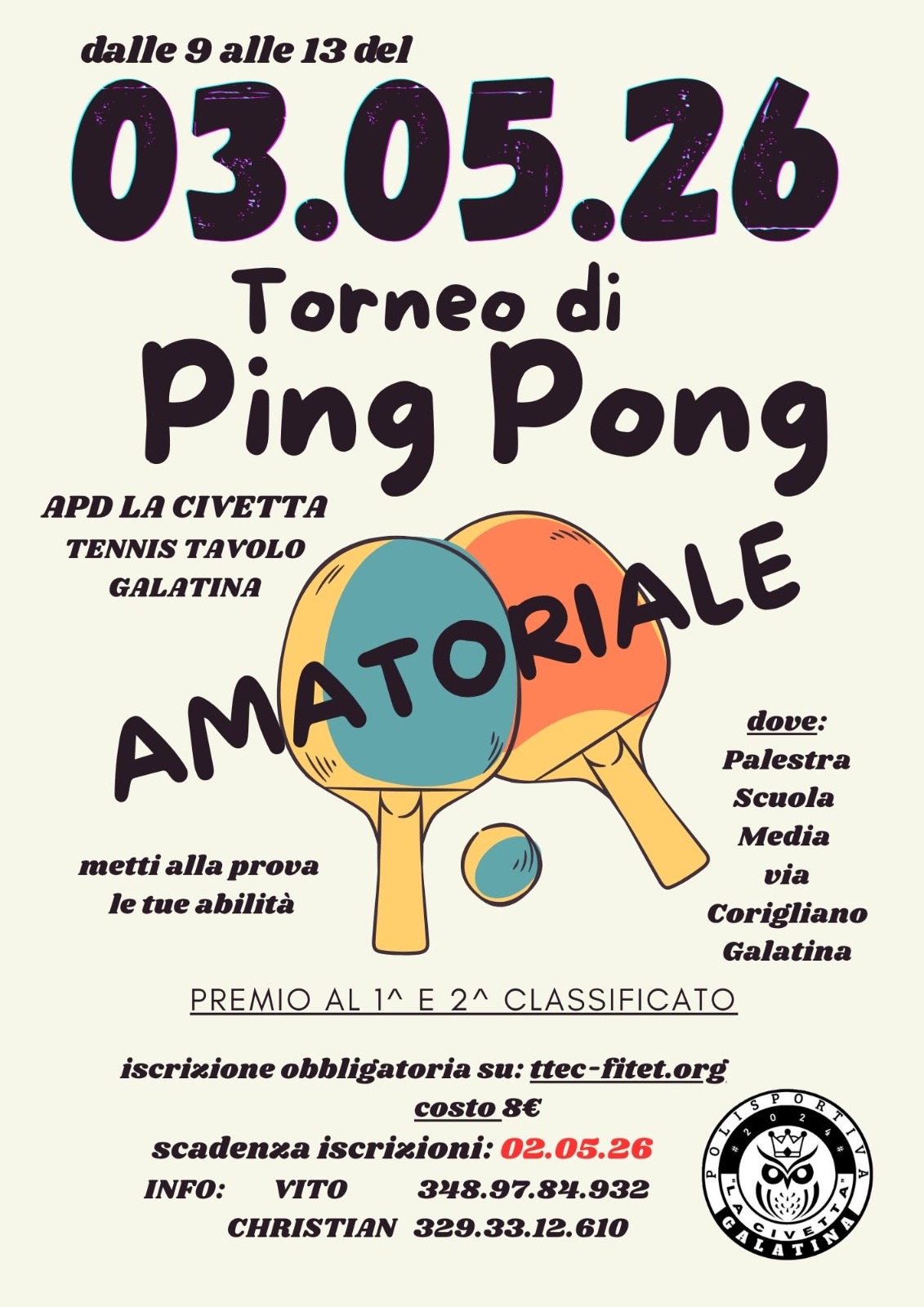 Il tennis tavolo amatoriale fa il suo ingresso ufficiale a Galatina con il primo torneo TTEC (Table Tennis Exclusive Community), in programma nella mattinata del 3 maggio presso la palestra della Scuola Media “Giovanni XXIII” di via Corigliano. L’evento è organizzato dalla Polisportiva La Civetta di Galatina, giovane realtà sportiva nata nel 2024 e già diventata punto di riferimento per gli appassionati locali di ping pong.