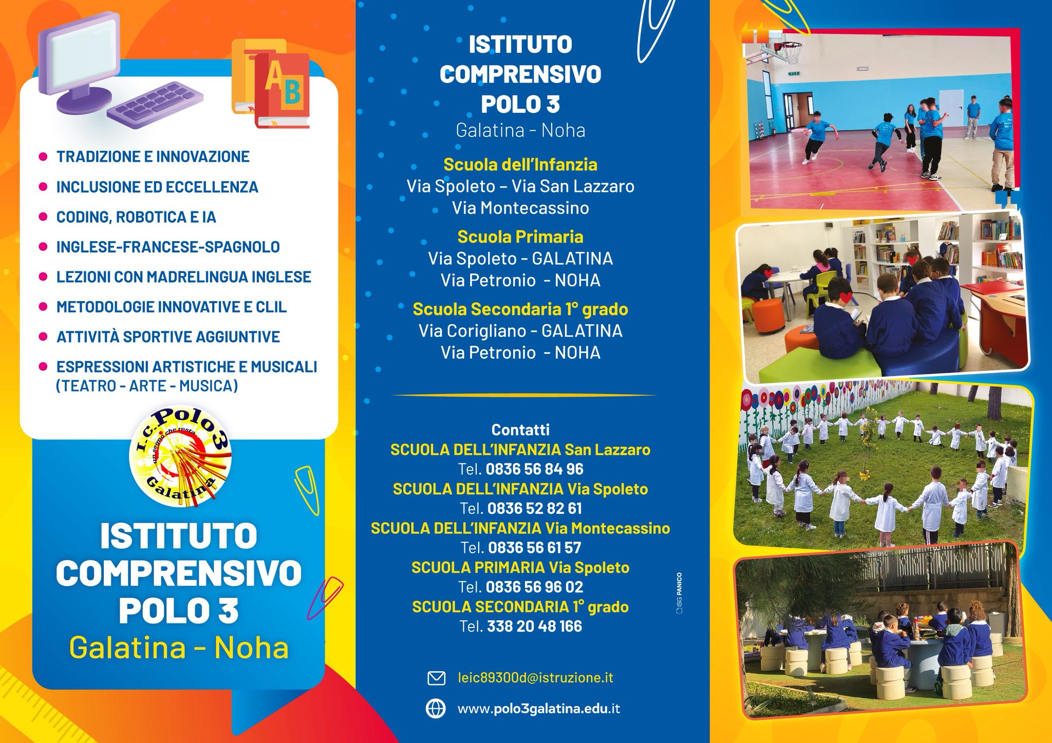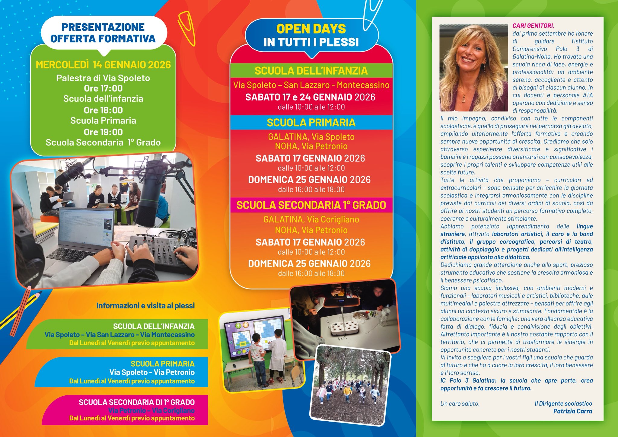 dal primo settembre ho l'onore di guidare l'Istituto Comprensivo Polo 3 di Galatina-Noha. Ho trovato una scuola ricca di idee, energie e professionalità: un ambiente sereno, accogliente e attento ai bisogni di ciascun alunno, in cui docenti e personale ATA operano con dedizione e senso di responsabilità.